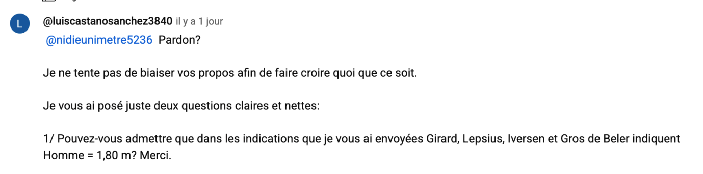 Luis Castaño m’a contacté afin de présenter ses hypothèses, notamment par rapport à celles avancées par Quentin Leplat. J’ai beaucoup échangé avec lui, surtout en 2019 et en 2020. Je lui avais alors indiqué que le modèle de l’homme de 180 cm ne reposait sur aucun document et aucune source, et que l’idée d’une permanence du modèle ou des mesures issues de l’Égypte antique, passant par les mondes grec et romain et se poursuivant au Moyen Âge, n’était pas fondée. Nous lui avions dit oralement que cette proposition confinait à de la pseudo-science.